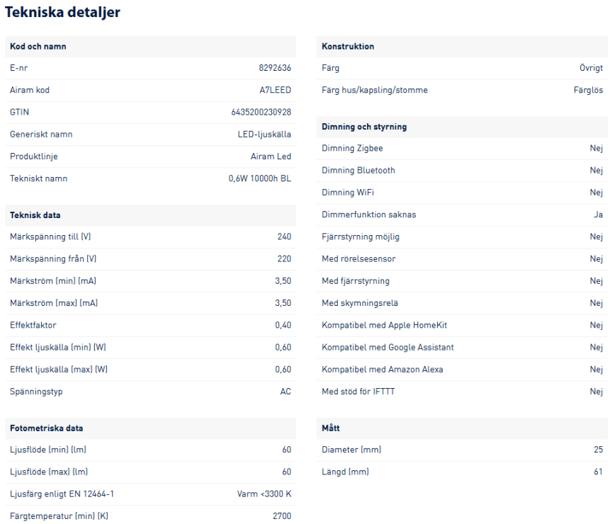 Klar päron filament LED-ljuskälla 0,6W 2700K E14 60lm 10 000h 25x61mm, Frekvens ~50/60Hz, 230V.