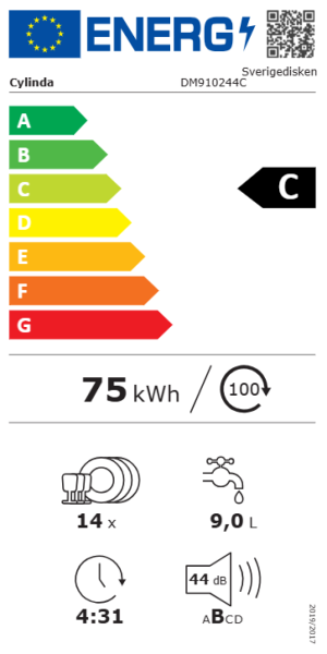 Med plats för 14 kuvert och en ljudnivå på bara 44 dB är Sverigedisken DM910244C från Cylinda både rymlig och behagligt tyst. Flexibla korglösningar, innerbelysning och automatisk lucköppning gör denna diskmaskin till en praktisk hjälpreda i vardagen.