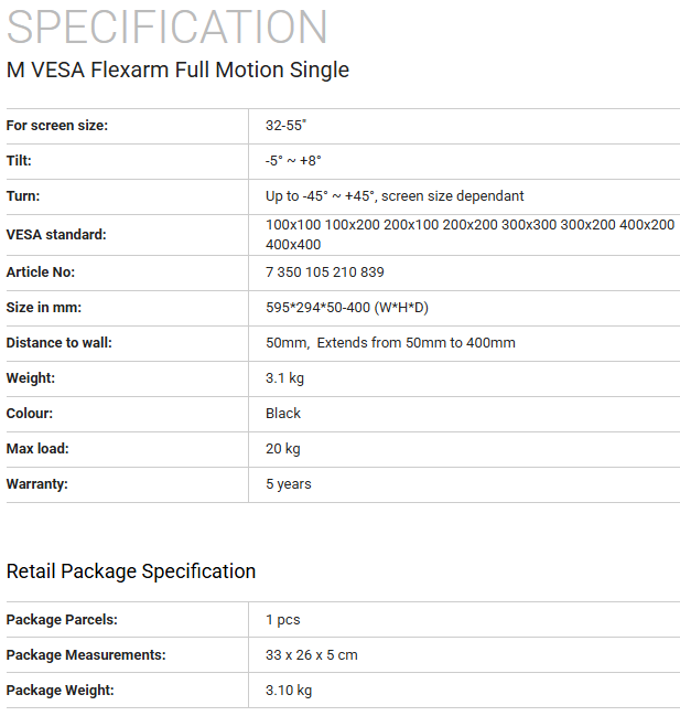 M VESA Flexarm Full Motion Single - Wall mount for LCD / LED panel - screen size: 32" - 55" - VESA: 100x100 to 400x400 - max load: 20 kg - black